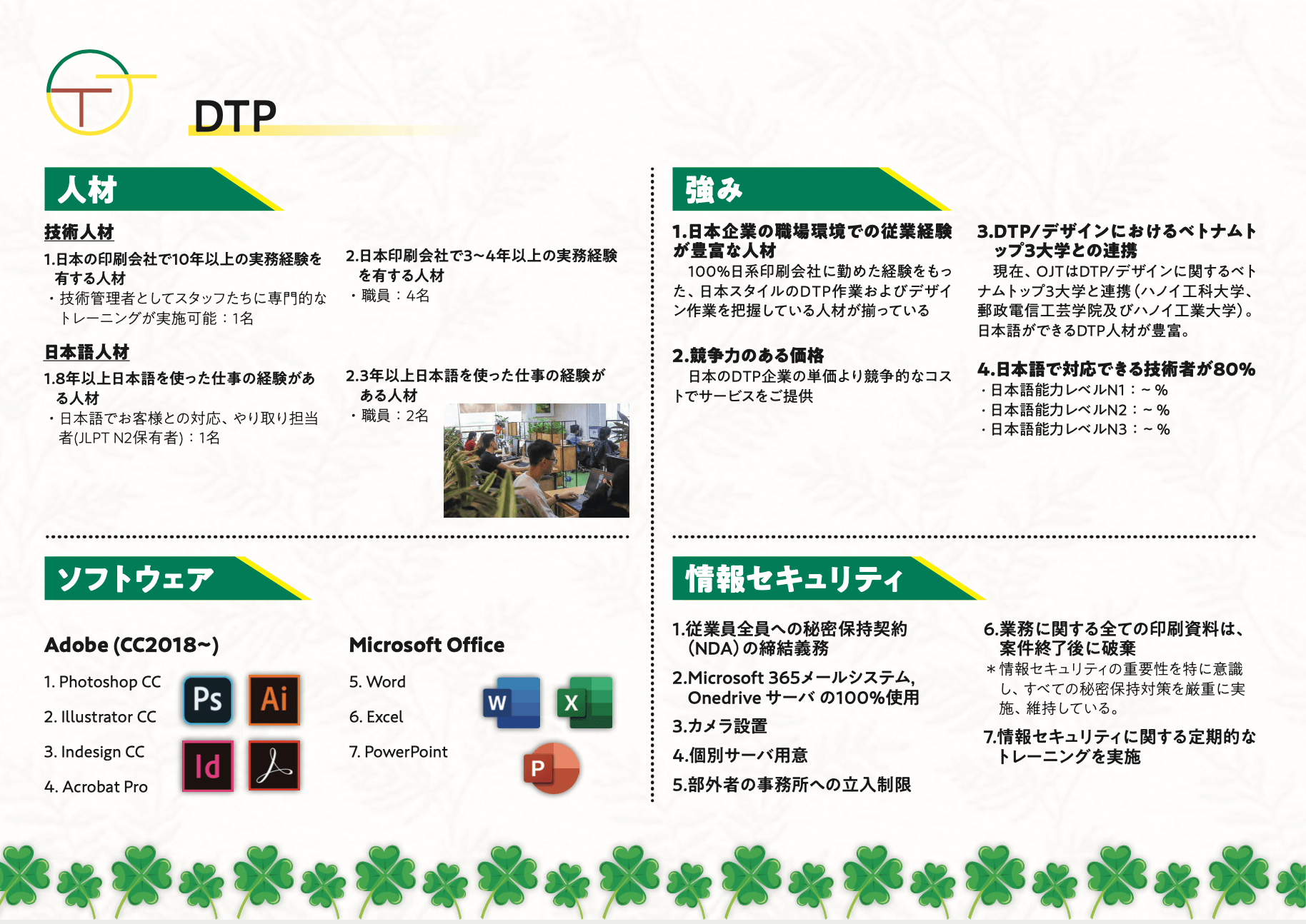 弊社DTPメンバーの多くは、ハノイ工科大学、郵政電信工芸学院、ハノイ工業大学といったDTP/デザインに関するベトナムトップ3大学を卒業し、日系の印刷企業・出版社といった企業クライアント様向けの実務経験を3年~10年もっております。さらに、日本語可能(N3以上)な15名のチームは、何よりも仕事に対する責任を持ってクライアントへ納品する完璧なDTP製品に全力で貢献しています。