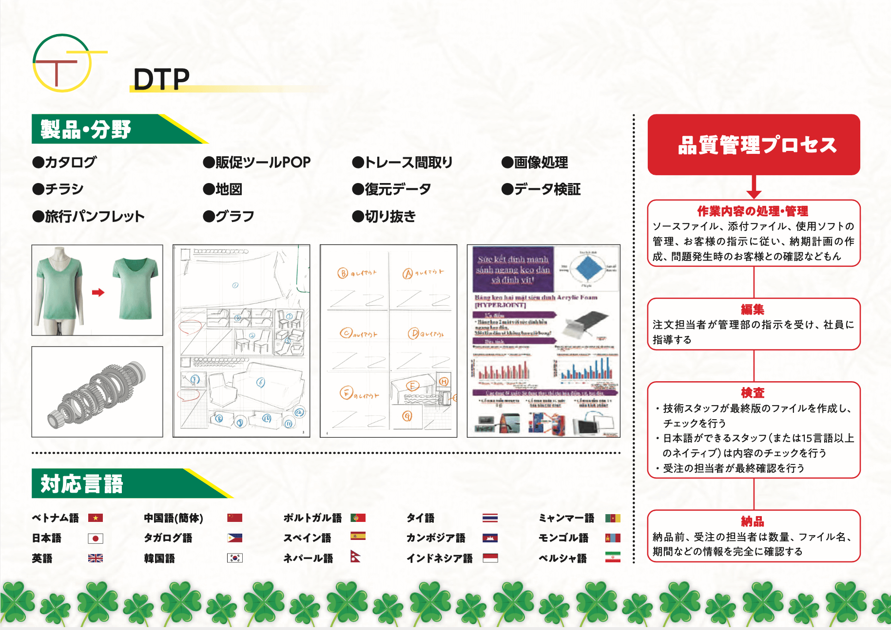 カタログ、チラシ、旅行パンフレット、販促ツールPOP、地図、グラフ、トレース間取り、データ復元、切り抜き、画像処理、データ検証など様々な書類タイプのDTPサービスをご提供しております。15言語以上で対応できる資料DTPサービスであり、それぞれの翻訳対象言語のネイティブがDTP版のレイアウトや誤字、 スペルミスなどのレビューを含む体制で、徹底した品質を確保しております。