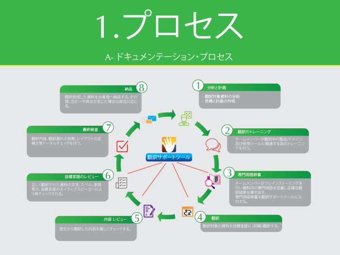 弊社には、高等専門教育を受けた経験豊富な翻訳者の他に、日本・アメリカ・イギリス人といったネイティブな協力者(その多くは大学の言語学講師)や、機械・IT・法律・証券の専門家によるコンサルティング協力者を擁し、翻訳から内容のレビューまで専門的なプロセスを通した翻訳を行っております。又、フォーマットチェック・ミス管理システム・更新の多い資料などを、効率良く行う為の様々な翻訳ツールも用いております。その結果、弊社の翻訳はその精度の高さ・専門用語の正確さ・納期厳守・美しく正確なフォーマット(最も複雑なフォーマットを持つCorelファイルや画像ファイルなどでも翻訳前資料フォーマットの90%以上を保証)により、お客様に大変ご満足頂いております。